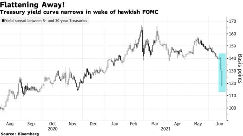 The 30-year bond yield fell as much as 16 basis points to 2.05% Thursday, its lowest level and biggest intraday drop since February. The plunge in long-end yields comes after new forecasts released Wednesday by central bank officials indicated two rate hikes by the end of 2023, a shift that’s driven up market rates in shorter maturities and put a check on longer-term inflation expectations. The combined flattening since the close on Tuesday was the most since the peak of the liquidity crisis last year.